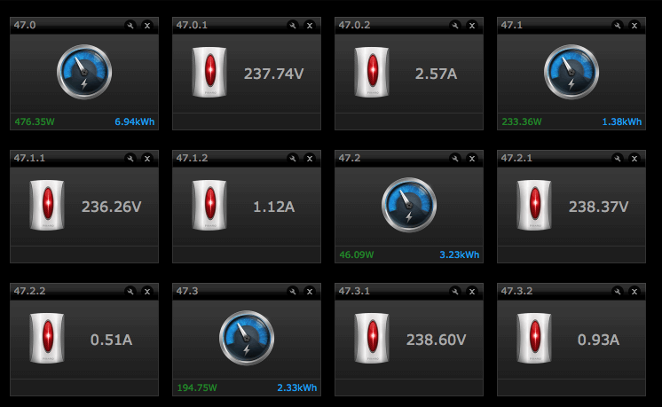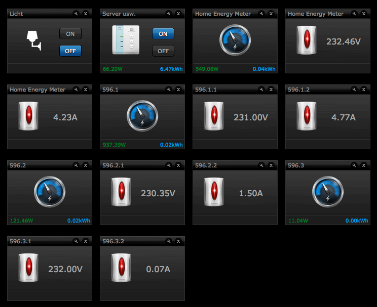 Einrichten im HC2 war auch einfach. Insgesamt tauchen 12 neue Geräte auf. Drei für Gesamtleistung, Spannung und Strom und dann noch jeweils drei pro Phase, wieder mit Leistung, Strom und Spannung. Es gibt auch einiges einzustellen für das neue Gerät. Ich habe erstmal die „reporting period“ auf 10s gesetzt. Leider scheint man dem HC2 nicht beibringen zu können, daß ein Meßgerät den Gesamtenergieverbrauch darstellt und all anderen nur Teilverbräuche. Das ist aber eher ein „Schönheitsfehler“ in der Verbrauchsübersicht. Ich wollte mir sowieso noch einen alten Tacho im Wohnzimmer installieren, der den Stromverbrauch anzeigt. Das wird dann mein Weihnachtsbastelproject ;-). Die zeitlichen Verläufe des Verbrauchs pro Phase sind allerdings sehr schön. Anbei noch ein Bild der verschiedenen Geräte.