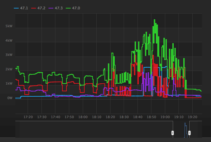 Es scheint nur ein Bild pro Posting zu gehen. Deshalb hier noch ein Beispiel für den zeitlichen Verlauf der Leistung. Grün ist die Gesamtleistung. Die drei anderen Farben sind die Leistungen der einzelnen Phasen. Bis 18:00 Uhr ist die Waschmaschine gelaufen. Danach die Zubereitung des Abendessens. An der „hellblauen Phase“ hängt der Wasserkocher. An der roten und lila die verwendeten Herdplatten. Es gab Spaghetti, die muß man in viel Wasser kochen ![]()