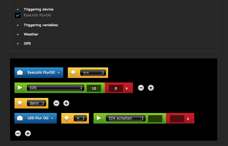 Den Licht Sensor auswählen und im grünen Feld den gewünschten LUX Wert eintragen, anschließend das Licht o.ä. auswählen.
