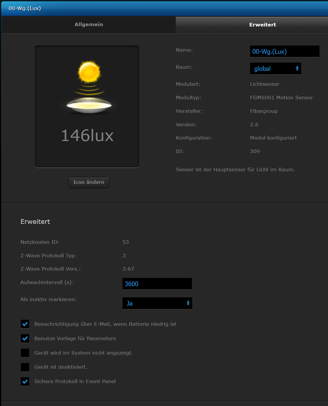 Ich verwende für das Script in diesem Blog zwei Fibaro Motion-Sensoren, die sich (manchmal) irgendwie unterschiedlich verhalten! Der Aufwachintervall (entspricht hoffentlich dem Aktualisierungsintervall?) steht auf 1 Stunde (3600), da ein häufigeres Abfragen auf die Batterie geht.