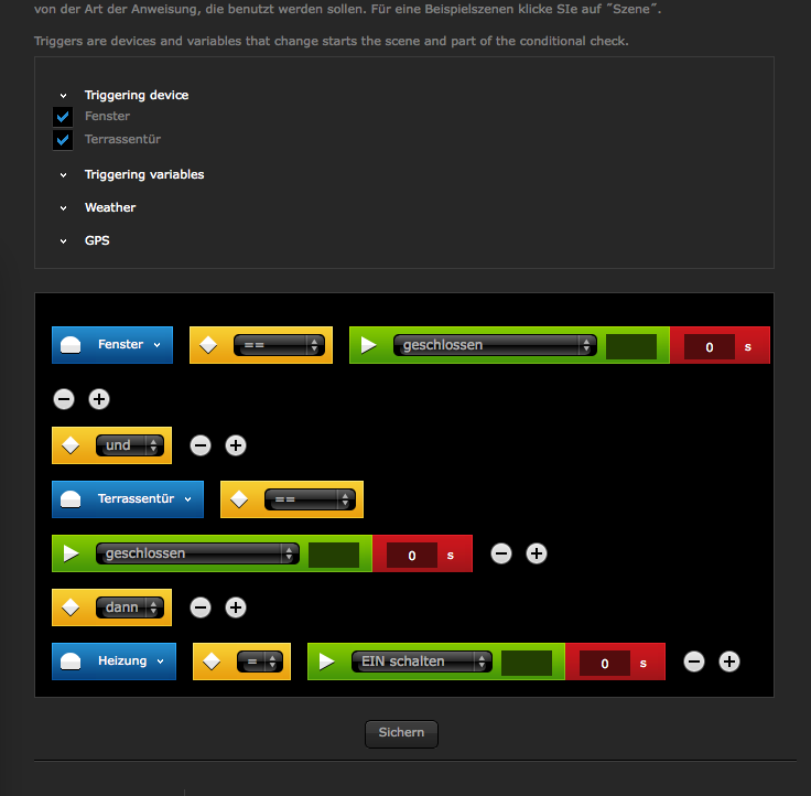 Kann ich denn eine Fenster auf - Heizung aus- Szene auch mit dem graphischen Tool bauen? Und muß ich dann eine Gradzahl in die grünen Felder und eine Zeit in die roten Felder eintragen?