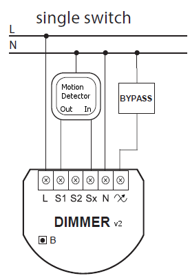 habe nun mal meinen herkömmliche Bewegungsmelder an einen Dimmer v2 angeschlossen. Verkabelung so wie auf dem Bild! Als Load einen Bypass 2 und die Parameter 20: „Toggle Switch“ sowie 32: „on/off mode enabled (dimming is not possible)“ eingestellt.