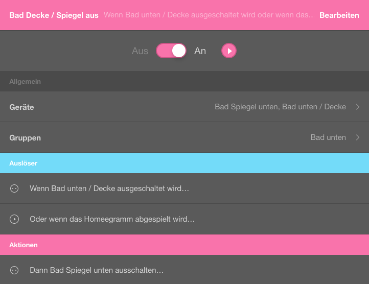 Nun habe ich ein Homeegramm angelegt (siehe anbei), ich möchte dass das Licht am Spiegel ausgeht wenn ich das Deckenlicht aus mache.