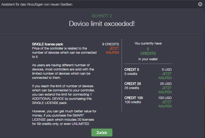Ganz toll! Jetzt habe ich die alte Box abgemeldet, die neue Box angemeldet und bekomme direkt beim Anmelden des ersten Gerätes eine Aufforderung, mir Credits zu kaufen. (Siehe Anhang)