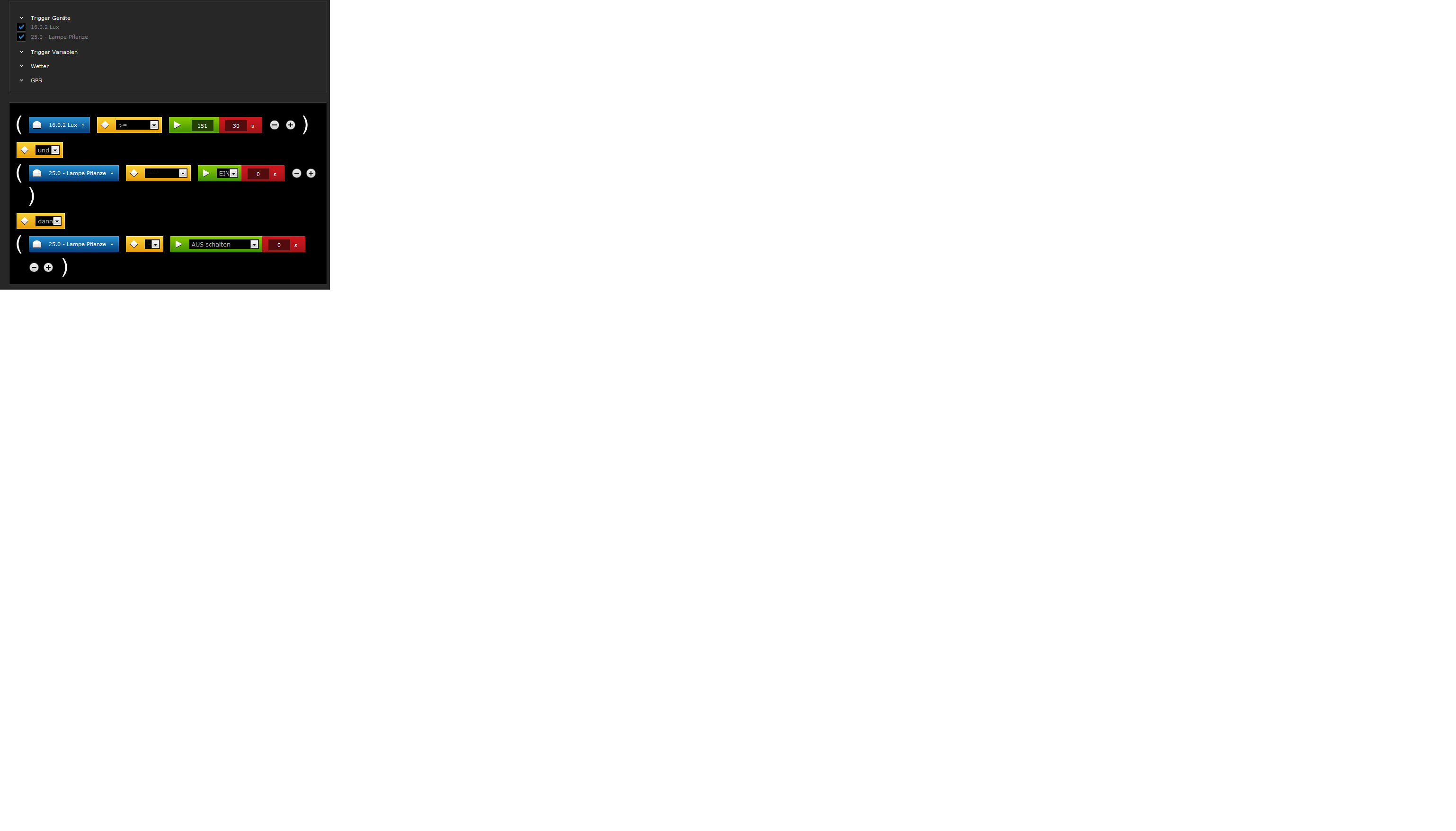 ich hab eine Lampe die über einen Wall Plug gesteuert wird. Die aktuelle Szene schaltet das Licht bei einem Lux Wert von >=151 aus und <=150 an. [siehe Bilder]