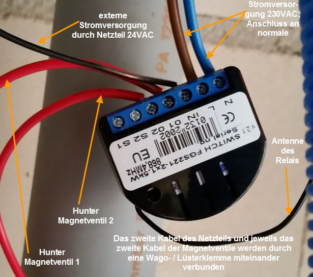 in der Anleitung. Das ist nötig, da die Ventile 24V benötigen aber anderseits das Relais 230V braucht zum Schalten.
