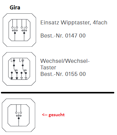 Gira 015500 = Dies sind jedoch zwei Taster nebeneinander (Druckpunkt jeweils unten) - Darüber wäre die Funktion möglich, möchte aber nicht unbedingt 2 Taster Gira 014700 = Wipptaster 4fach, wieder zwei Taster jedoch mit Mittelstellung, da die zwei Taster oben und unten betätigt werden können. - Sehr nett in Kombination mit dem FGS-212