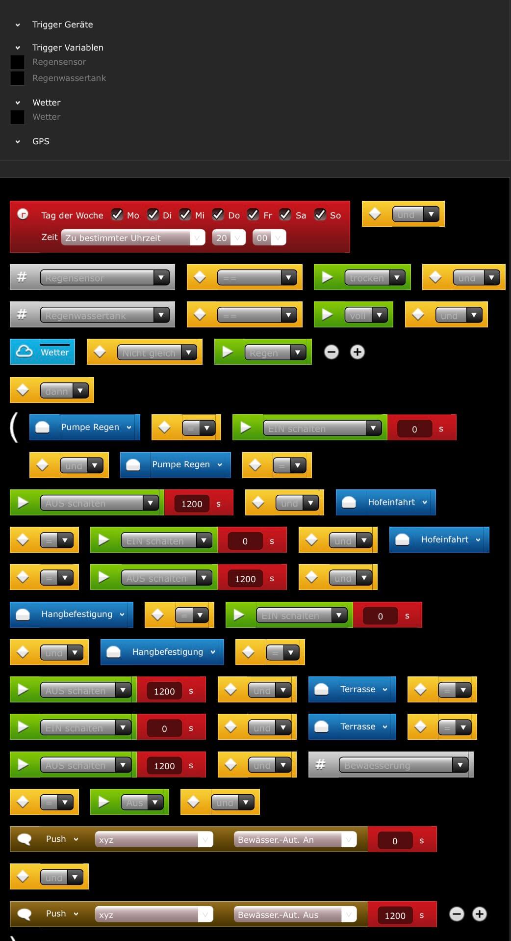 ( ((currentDate.wday == 1 or currentDate.wday == 2 or currentDate.wday == 3 or currentDate.wday == 4 or currentDate.wday == 5 or currentDate.wday == 6 or currentDate.wday == 7) and string.format(„%02d“, currentDate.hour) .. „:“ .. string.format(„%02d“, currentDate.min) == „20:00“) and fibaro:getGlobalValue(„Regensensor“) == „trocken“ and fibaro:getGlobalValue(„Regenwassertank“) == „voll“ and fibaro:getValue(3, „WeatherConditionConverted“) ~= „rain“ )