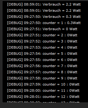 fibaro:debug(„Verbrauch = „..power..“ Watt“)