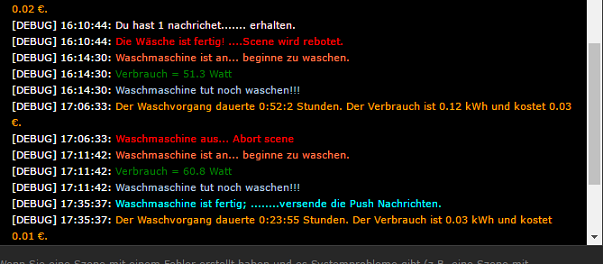 debug('orange',"Die Trocknung dauerte "..convertTime(EndWaschZeit - StartWaschZeit).." Stunden. Der Verbrauch ist "..string.format("%.2f", energyverbrauch()).." kWh und kostet "..string.format("%.2f", energyverbrauch()*ct/100).." €.");