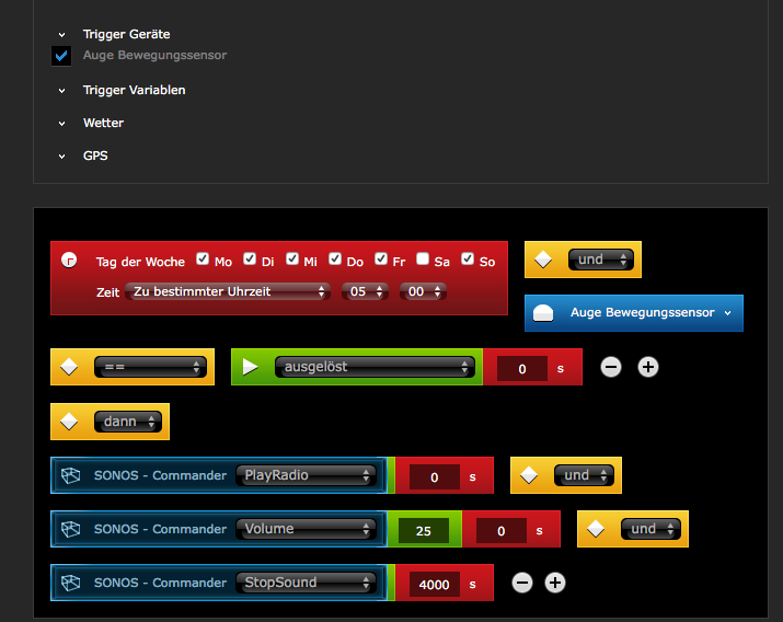 Ich habe die Suchfunktion genutzt, komme aber scheinbar über ein grundlegendes Verstädnisproblem einfach nicht hinaus. Ich will eine Szene triggern. Der Motionsensor löst ab 05:00 Uhr während der Woche Licht anschalten aus und spielt einen Radiosender über den im Bad befindlichen Sonoslautsprecher. Den Sonoslautsprecher habe ich mit einem virtuellen Modul (Tipp aus dem Inet) zum Abspielen des Wunschsenders gebracht.