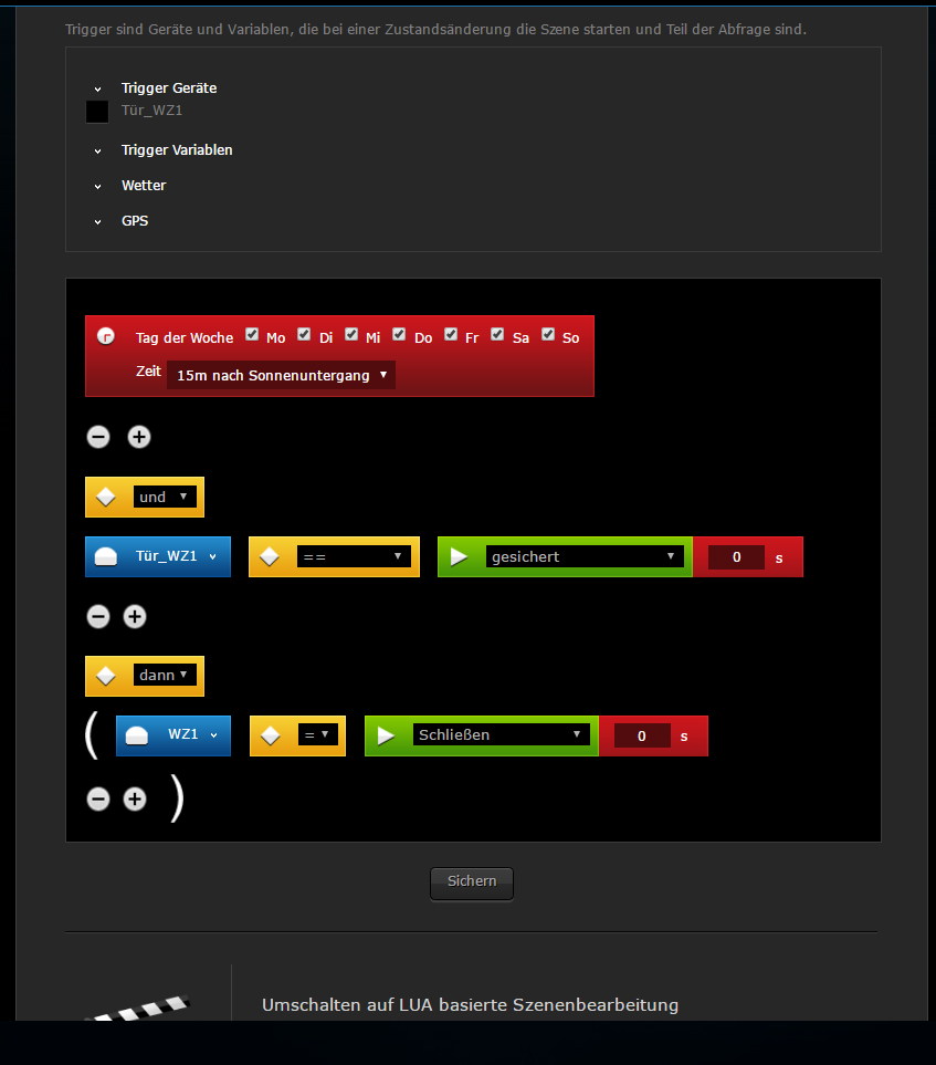 ich hatte mir eine Blockszene für meinen Raffstore nach meiner Logik erstellt: Wenn Sonnenuntergang +15 Minuten und Türkontakt sagt „Tür zu“ dann fahre den Raffstore runter.
